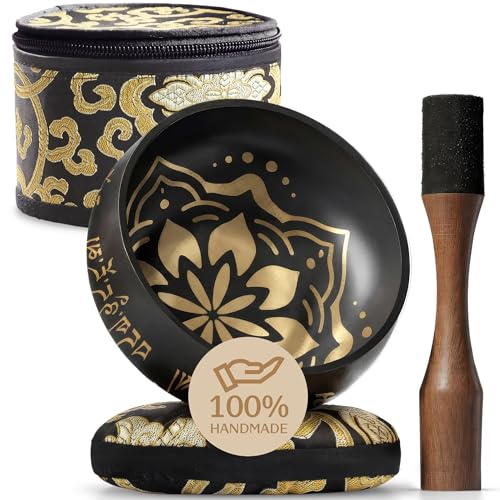 Handmade Tibetan Etched Singing Bowl Set with Case – Meditation Bowl & Sound Bowl with Cushion, Mallet & Guide – Stress Relief Instruments – Yoga Therapy Tools – Mindfulness Gift Set