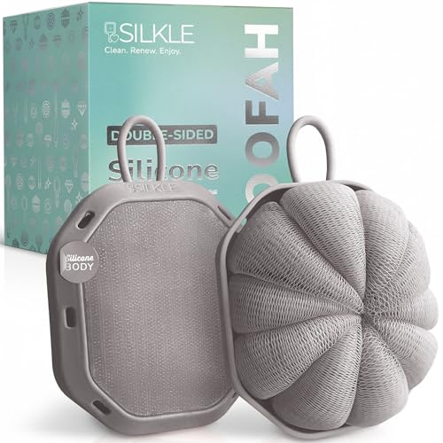 SILKLE Double-Sided Shower Loofah - Gentle Exfoliating Body Scrubber & Shower Scrubber for Men & Women, Non-Slip Silicone Grip, Soft Mesh & Firm Sides, 2-in-1 Bath Sponge & Loofah - 2 Pack, Gray