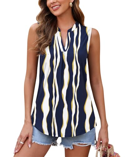 AUSELILY Womens 2026 Summer Tank Tops Causal Ladies V Neck Sleeveless Loose Pleated Shirts Blouse Navy Irregular Strips M