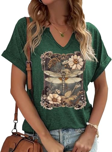 Womens Dragonfly Floral V Neck Shirt Funny Boho Dragonfly Graphic Short Sleeve Tee Nature Lover Summer Tops(L,C-Green-1)