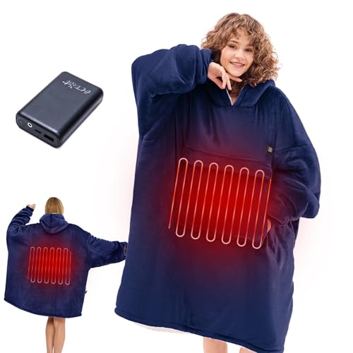 CYMULA Heated Hoodie Blanket, Wearable Heated Blanket Hoodie Oversized Portable Cordless Heating Wearable Blankets, 3 Heat Settings Electric Hooded Gifts for Women Men with Power Bank, Blue
