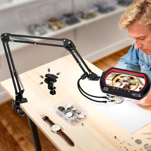 KUVRS 12X Ultra Long 3-Section Magnifying Glass with Light and Stand, 5 Color Dimmable LED Lighted Magnifier, 5.39×3.27 Inch Square Desk Lamp with 4-Way Clamp for Hobby Workbench Repair Reading