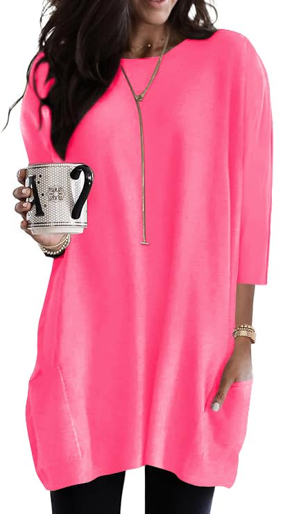 Poetsky 3/4 Sleeve Shirts for Women Dolman Sleeve Tops with Pockets Oversized Tshirts Trendy Summer Tops Neon Pink M