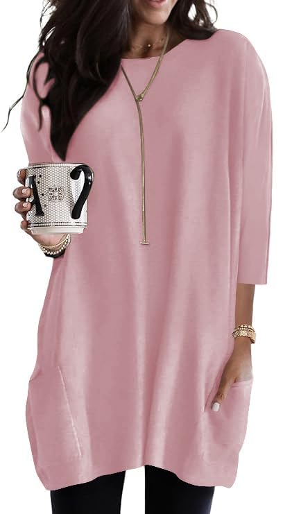 Poetsky Womens Tunic Shirts 3/4 Sleeve O Neck Blouse and Tops to Wear with Leggings Pink