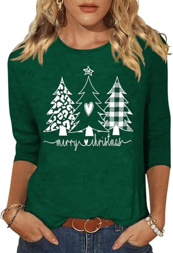 Woffccrd Womens Christmas 3/4 Sleeve Crew Neck T-Shirts Merry and Bright Leopard Christmas Tree Graphic Tee Tops (S,Green 2)