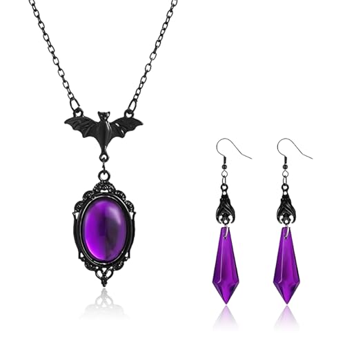 RLHRNDE Gothic Bat Glass Necklace Earrings Set for Women Vintage Punk Vampire Bat Pendant Necklace Blood Red Crystal Earrings Halloween Cosplay Mystic Witch Jewelry Set (Purple)