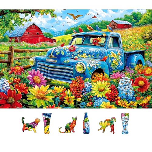 MINIWAN 500 Piece Jigsaw Puzzle for Adults - Vintage Blue Truck in Flower Field, Countryside Farm & Unique Cat-Shaped Pieces, 23x15 Inch Art Puzzle, Challenging Hard Difficult Puzzles for Adults