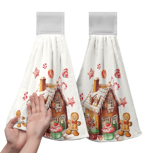 Kwlegh Christmas Gingerbread Man Hanging Kitchen Towels Cookies Candy Cane Hand Towel with Hanging Loop Ginger Bread House Dish Towels Xmas Soft Absorbent Fingertip Bath Tea Towel Decor Set of 2