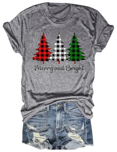 Woffccrd Womens Funny Christmas Shirts Merry and Bright T-Shirts Christmas Tree Shirts Merry Christmas Graphic Tee Tops (M,25JC 3 Grey)