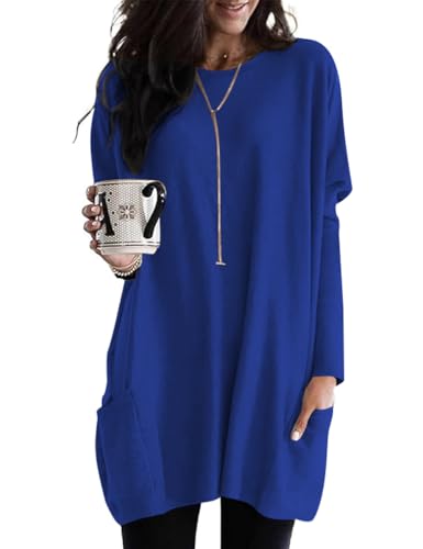 Womens Basic Tops Tunic Oversized Cute Shirts Long Sleeve Royal Blue Blouses Dressy Casual With Pockets Cute Outfits Trendy Plus Size To Wear With Leggings L