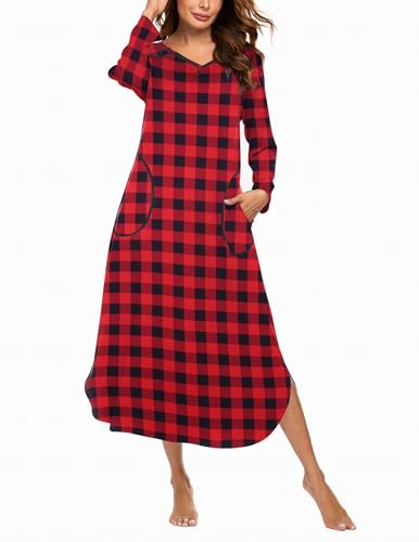 Ekouaer Women's Nightgown V-Neck Loungewear Long Sleeve Sleepwear Full Length Nightgown for Women Red & Black Plaid Medium