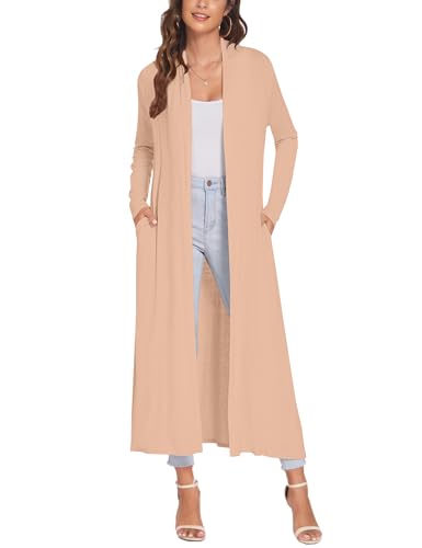 Bluetime Women Floor Length Open Front Cardigan Lightweight Long Sleeve Maxi Duster with Pockets (XXL, Light Camel)