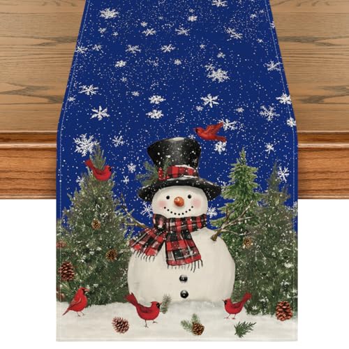 Artoid Mode Snowman Birds Trees Christmas Table Runner, Seasonal Blue Winter Holiday Kitchen Dining Table Decoration for Indoor Outdoor Home Party Decor 13 x 90 Inch