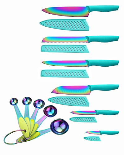 Knife Set with Spoons, KYA37B Knife Sets with Blade Guards and Measuring Spoons, Marco Almond® Rainbow Color 17-Piece Stainless Steel Kitchen Knives Set with Covers