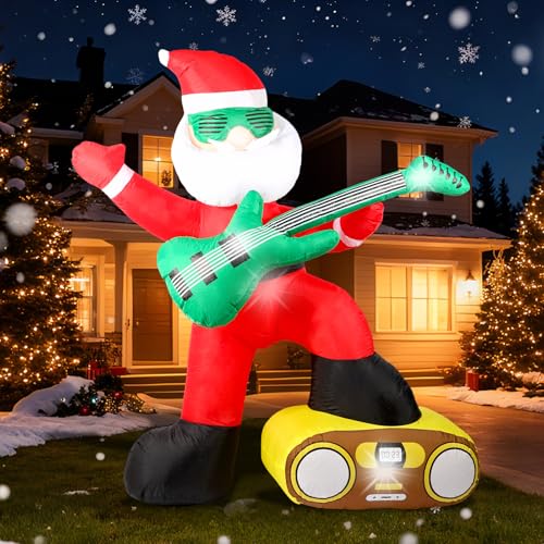 6FT Christmas Inflatables Decorations Outdoor,Blow Up Santa Claus with a Guitar with Built-in LEDs Lights for Indoor Holiday Party Yard Garden Lawn Décor