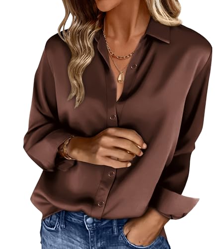 OFEEFAN Button Down Shirts Silk Blouse for Women Casual Fashion Outfit Long Sleeve Work Clothes Business Satin Tops Coffee M