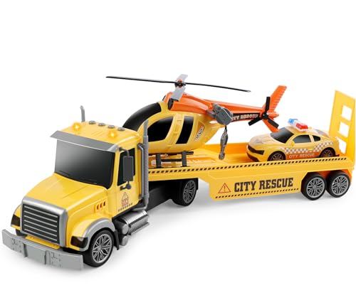 Dwi Dowellin 27" Large Friction Powered Tow Truck Toy with Car and Helicopter,Semi Truck Toys for 3 4 5 6 Years Old Toddlers Kids Boys & Girls Gift