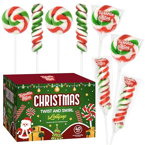 40 Pack Christmas Lollipops - Individually Wrapped Christmas Holiday Themed 20 Twist And 20 Swirl Suckers - Colorful Red & Green Designs & Delicious Strawberry And Tutti Frutti Flavors - Bulk Candy Use For Stocking Stuffers, Party Favor, Classroom & Office Treats