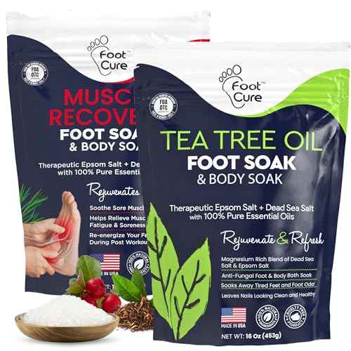 FOOT CURE Tea Tree Oil & Muscle Foot Soak with Epsom Salts - All-Natural Salts for Post-Workout Recovery - Softens Calluses, Soothes Sore & Tired Feet, Foot Odor Control, Spa Pedicure (Pack of 2)