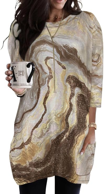 Poetsky Dressy Casual Blouses for Women with Pockets 3/4 Length Sleeve Crew Neck Tunic Shirts Boho Going Out Tops Fall Teacher Outfits Aurora Brown M