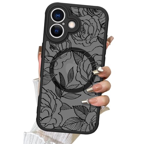LSL Case for iPhone 17 6.3 Inch Compatible with Magsafe Black Floral Flowers Translucent Matte Shockproof Protective Slim Silicone Magnetic Case for Women Girls, Rose Flower