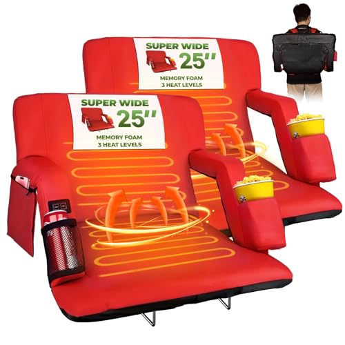powerful xishan 25'' Wide Dual-Side Heated Stadium Seat with Back Support, Comfy Cushion, 3 Levels Heating Stadium Seating, Portable Foldable Chair for Outdoor Bleachers Camping Games, 2 Pack Red
