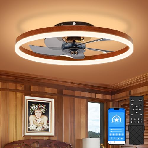 VOLISUN Farmhouse Ceiling Fans with Lights and Remote, 19.7in Low Profile Ceiling Fan Flush Mount, 3000K-6500K Dimmable Bladeless Fandelier Ceiling Fans with Lights for Bedroom(Walnut)