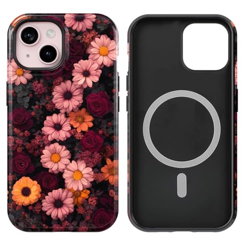 BayPastel X for iPhone 15/14/13 Case Design Strong Magnetic Cute Slim [Compatible with MagSafe] Wireless Charging Phone Case 2 in 1 Shockproof Heavy Duty Protection Cover 6.1",Red Rose Daisy
