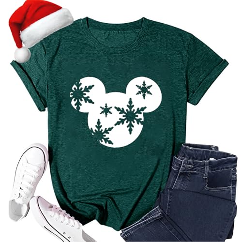 Womens Christmas O Neck Shirt Family Magical Santa Day Tee Classic Vacation Colorful Snowflake T-Shirt Loose Fit Funny Festive Xmas Retro Short Sleeves,Green XL