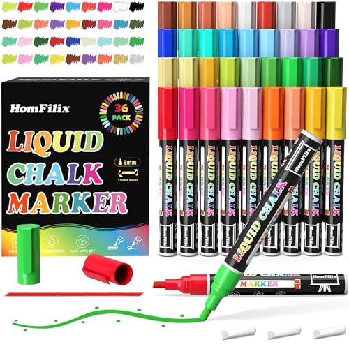HomFilix 36-Color Liquid Chalk Markers Set, Erasable, Dust-Free, for Blackboard, Glass, Cars, Windows - Ideal for Display, Creativity, Art Projects, Dry Erase Markers