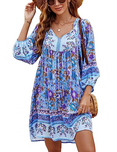 Bluetime Women Casual Summer Dress Boho V Neck 3/4 Sleeve Babydoll Floral Print Flowy Beach Dress (M, Very Peri)