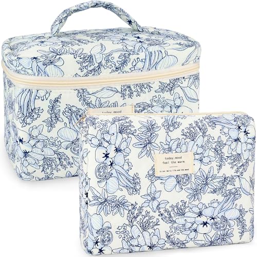 URSKYTOUS 2Pcs Cotton Quilted Makeup Bag for Women Girls Floral Travel Large Small Cosmetic Bag Set Cute Vintage Flower Makeup Pouch Portable Toiletry Bag Organizer Coquette Aesthetic Makeup Brush Bag