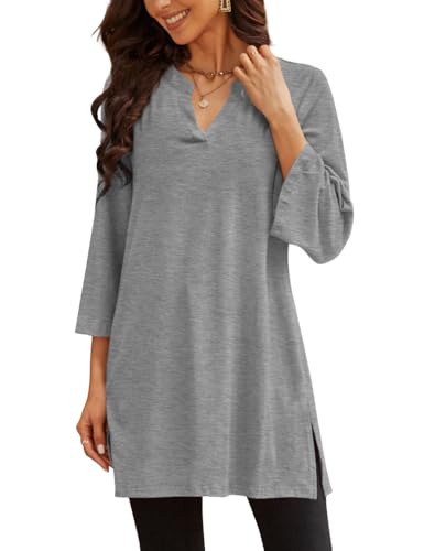 Poetsky Womens 3/4 Sleeve V Neck Tops Casual Tunic Blouses Loose Dressy Shirts with Pockets Grey