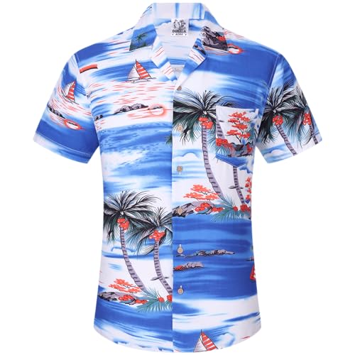 DOKKIA Men's Casual Tropical Floral Short Sleeve Luau Beach Aloha Hawaiian Shirt Blue Sailboat Island Palm Tree Medium