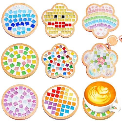 Reallnaive 8 Sets Christmas DIY Mosaic Tiles for Crafts Mixed Color Glass Mosaic Kits Xmas DIY Coasters Kit Make Your Own Stained Glass Coaster for Handmade Holiday Decoration Gift (Fresh Style)
