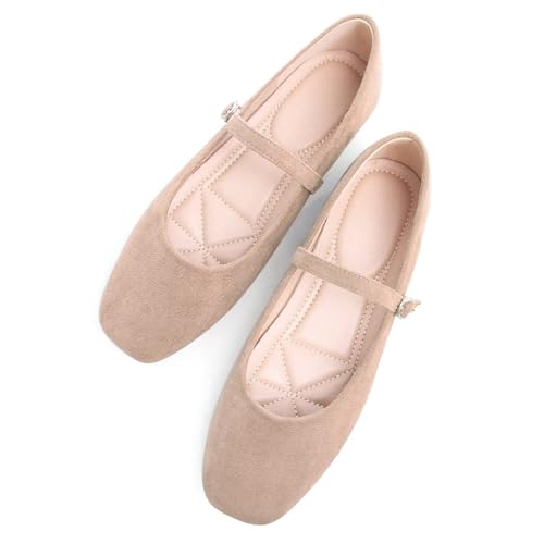 Stunner Women's Mary Jane Ballet Flats Fashion Square Toe Ankle Strap Flats Comfortable Casual Slip On Dress Shoes Khaki 44(10.5)