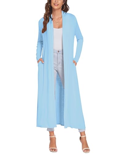 Bluetime Women Floor Length Open Front Cardigan Lightweight Long Sleeve Maxi Duster with Pockets (M, Light Blue)