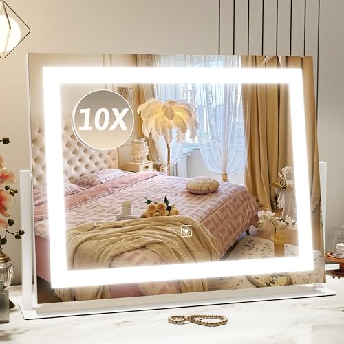ROLOVE Vanity Mirror with Lights 22"x18", Lighted Makeup Mirror with 10X Magnification, Smart Touch 3 Colors Dimmable, 360° Rotation, Women Gift, Dresser Mount, Bathroom (White)