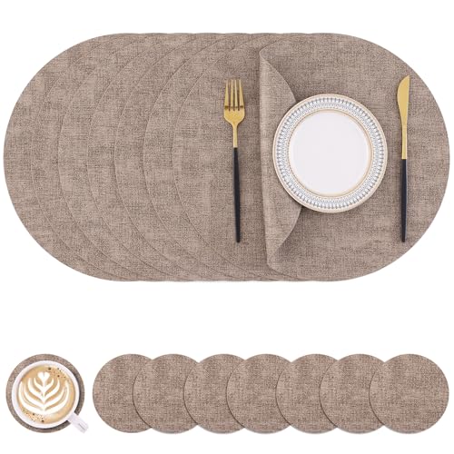 Homaxy Round Faux Leather Placemats and Coasters, Washable Dual-Side Table Mats, Wipeable Heat-Resistant Dining Place Mats for Outdoor and Indoor, Set of 8, Diameter 13 and 3.93 inch, Light Brown