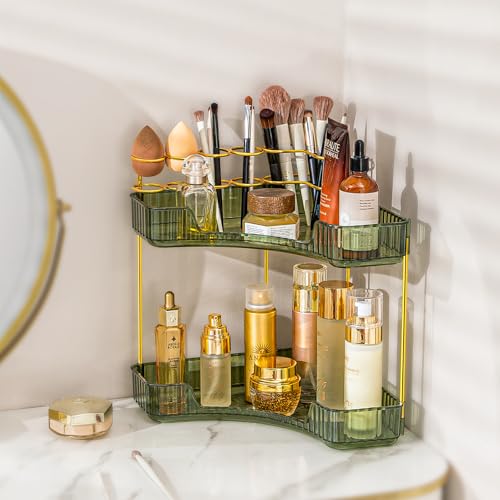 shuang qing Upgraded 2-Tier Corner Bathroom Countertop Organizer – Spacious Storage for Makeup, Skincare & Perfumes, Built-in Brush Holder Fits Vanity/Dresser/Bsthtub (Sage Green)