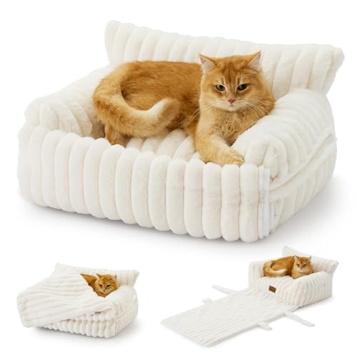 COZY KISS Cute Cat Bed with Removable Cover, Multifunctional Plush Faux Fur Pet Couch Bed with Blanket, Ultra-Soft Pet Furniture for Cats & Small Dogs (Cream, S: 25''x18'')