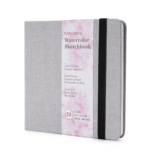 tumuarta Square Watercolor Sketchbook, 6x6, 140 LB, 300GSM, 100% Cotton Paper, Cold Press, 24 Sheets,48 Pages, Watercolor Journal for Use As Plein Air Sketch Book and Mixed Media Pad On The Go.
