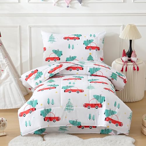 JSD Red Cars Christmas Tree Toddler Bedding Set, 4 Piece Bed-in-Bag Comforter Sheet Set, Machine Washabale Comfortable