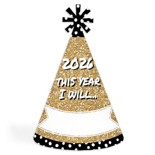 Big Dot of Happiness Pop, Fizz, Clink! - Cone Party Hats - 2026 New Year's Eve Resolution Cone Party Hat for Kids and Adults - Set of 8 (Standard Size)