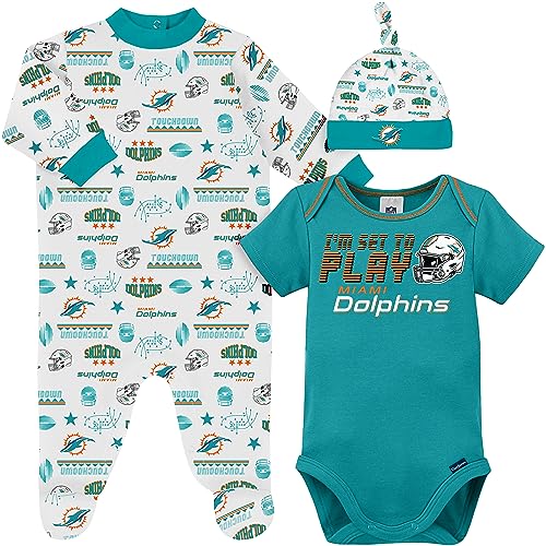 Gerber NFL Baby Boys' 3-Piece Bodysuit, Sleep 'n Play, & Cap Set, Miami Dolphins, 6-9 Months