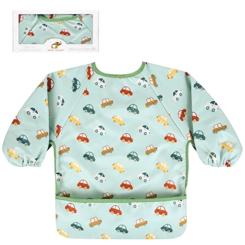 BEBE FAVOUR Baby Long Sleeve Bib For Eating Feeding Mess Proof Waterproof Food Smock Bibs With Pocket For Newborn Boy Girl (Green Cars)