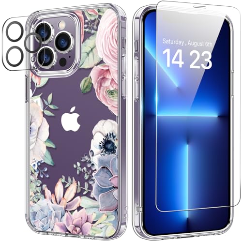bicol for iPhone 14 Pro Max Case with Screen and Camera Lens Protector - Fashionable Flower Floral Designs for Women Girls - Shockproof Acrylic Clear Phone Cover 6.7"- Colorful Succulents