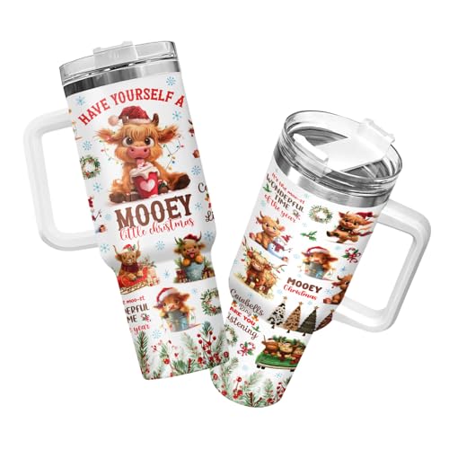34HD 40oz Christmas Cow Tumbler with Handle – Mooey Holiday Mug, Cute Highland Cow Gift, Winter Travel Cup