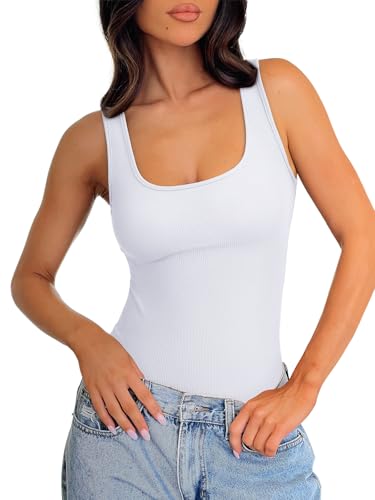 REORIA Body Suits Tank Top for Women Scoop Neck Sleeveless Ribbed Sexy Slimming Bodysuit Tops 2026 Summer Going Out Outfits White X-Large
