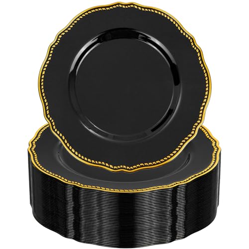 Hioasis 60pcs Black Plastic Plates - Black and Gold Disposable Dinnerware with Gold Rim, Heavy-duty, 7.5 inch, Dessert Plates for Party & Halloween